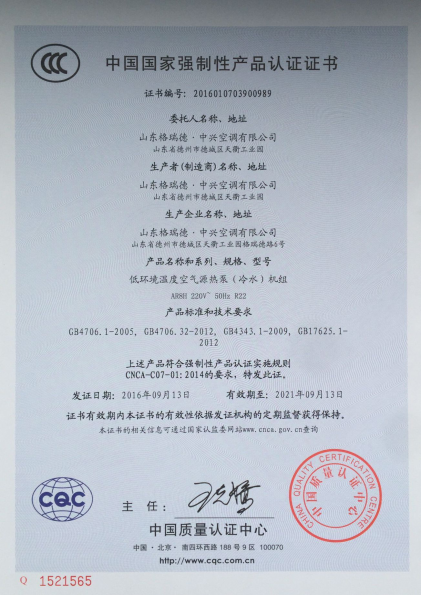 近日,主机公司生产的AR8H、 AR15H低环境温度空气源热泵(冷水)机组通过国家权威检测机构检测,并荣获CCC认证证书。 该单元机组获得CCC认证,充分体现了主机公司的技术设计、生产加工和质量管控能力。此类机组适用于国家推行的“煤改电”项目,公司可积极参与全国各地“煤改电”项目的投标。