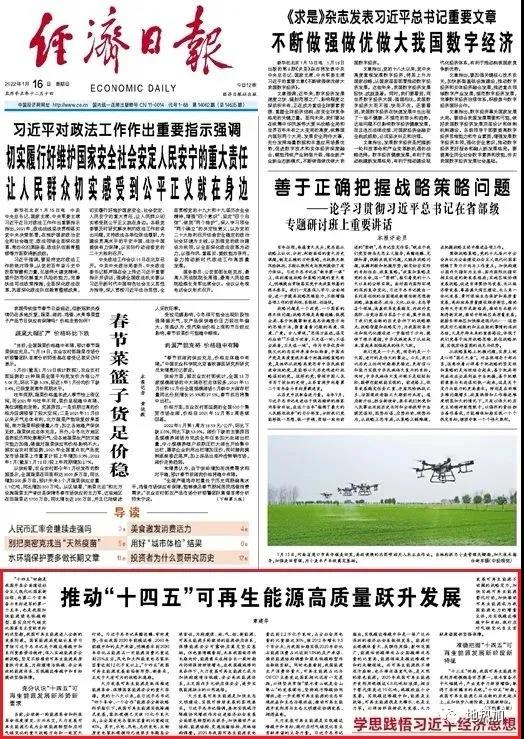 1月16日,国家能源局局长章建华在《经济日报》头版发表署名文章《推动“十四五”可再生能源高质量跃升发展》。