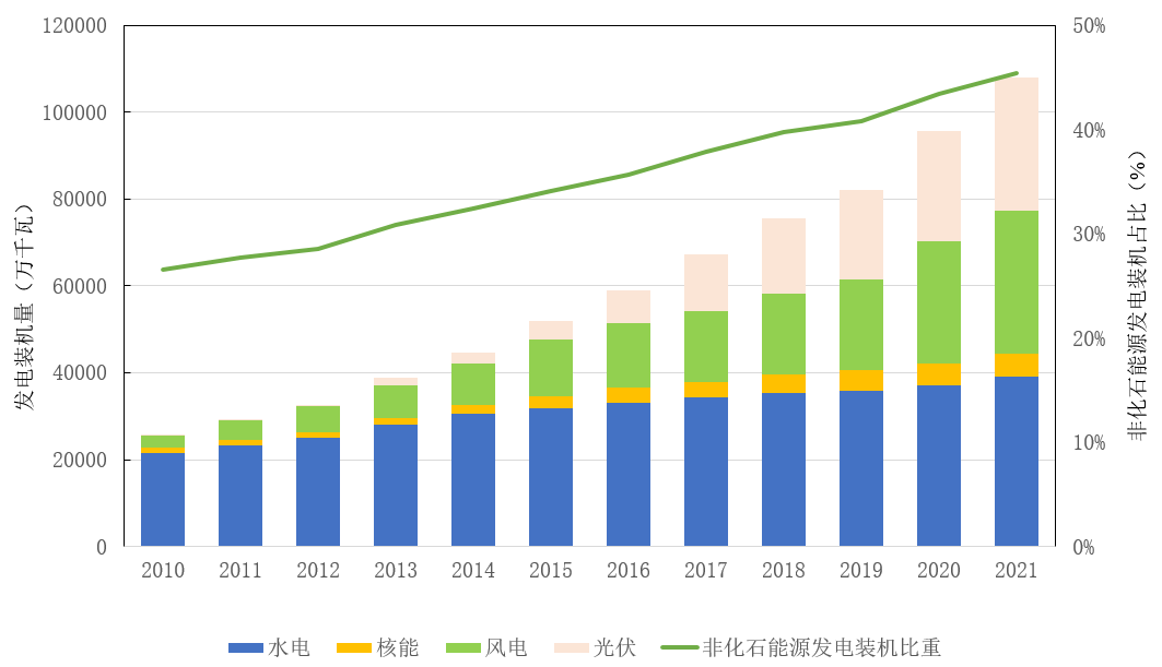 2021年,我国非化石能源占能源消费比重达到16.6%,风电、太阳能发电总装机容量达到 6.35 亿千瓦,单位GDP煤炭消耗显著降低。