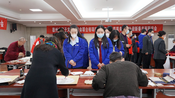 格瑞德集团董事长助理、公共管理中心总监白晓云,德州市董子文化研究会执行主席、省运河经济文化研究中心德州联络处主任、《环境与生活》杂志社副总编麻然松,德州市董子文化研究会副主席、德州市委统战部原副部长邹岩、德州市长河书画家协会周淑云会长等领导出席活动,对老艺术家的奉献和爱心表示了感谢。大家表示,以书画的形式迎接2023年春节很有意义。