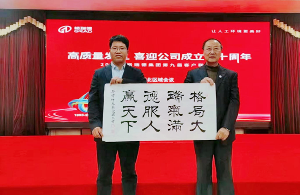 会议最后,南方大区总经理曹大军和湖北分公司总经理张文桥进行年初责任状签字仪式,集团执行总裁管志广授旗,湖北分公司总经理张文桥带领湖北分公司全体员工进行出征宣誓,湖北省制冷协会秘书长张定国赠予墨宝藏头诗贺词,本次客户联谊会圆满结束。