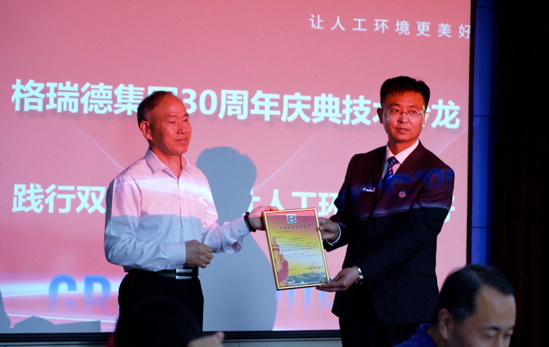 座谈会现场,合肥通用机电产品检测院有限公司副院长李道平与洁净空调工程公司总经理徐红刚共同为山东格瑞德集团有限公司与合肥通用机电产品检测院产学研合作单位揭牌,此次合作标志着双方产学研合作关系迈入新阶段,双方将携手同行,共同致力于暖通空调产品技术的深度研发。随后,合肥通用机电产品检测院有限公司副院长李道平授予山东格瑞德集团有限公司离心式冷水机组产品特性认证证书,充分体现了格瑞德集团先进的技术研发水平。