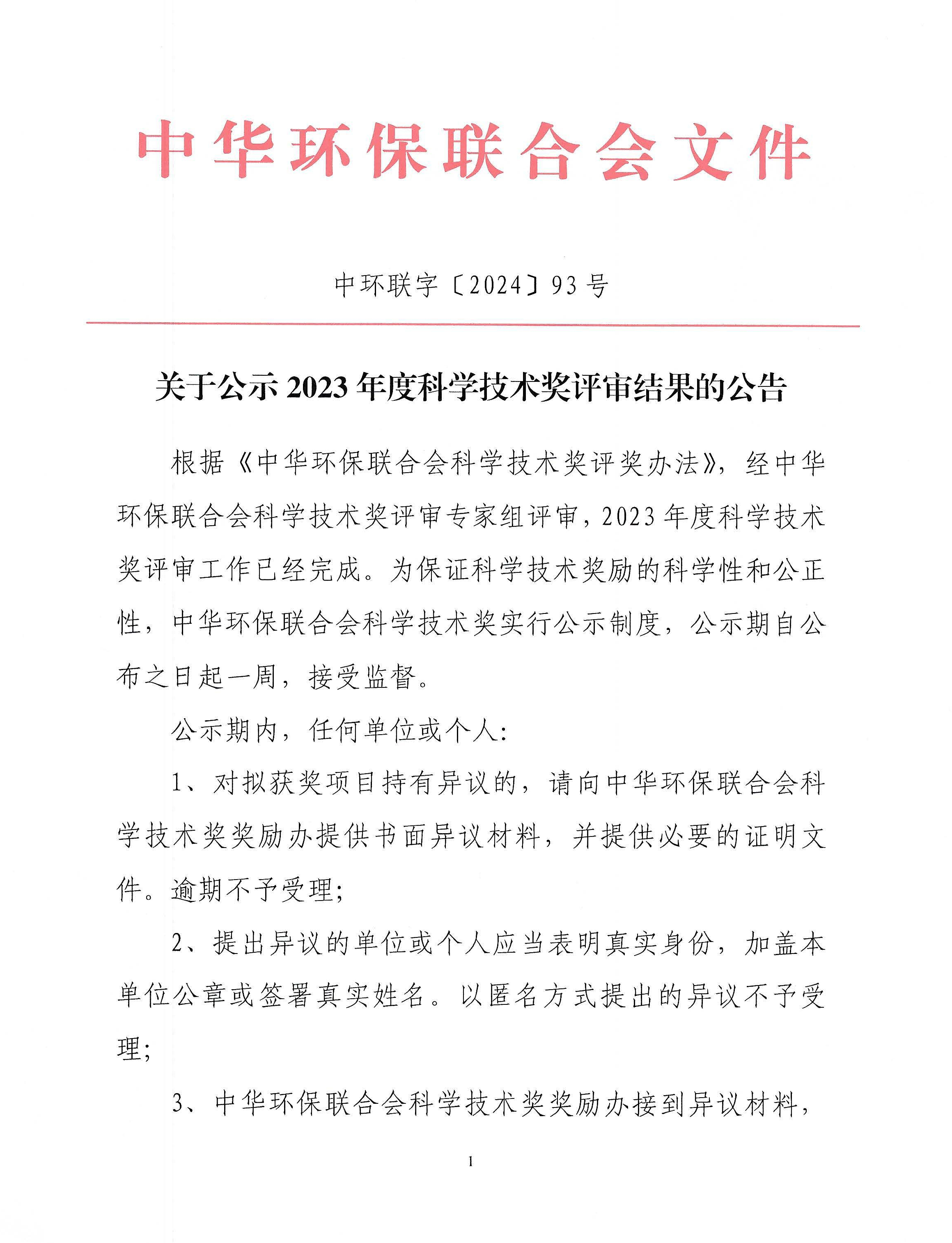 中华环保联合会科学技术奖是中国环保领域最高级别的荣誉奖项之一。该奖项评审每年开展⼀次,接受国家科学技术奖励⼯作办公室的管理和监督,其评审委员会由环保行业权威专家组成,评选过程严谨公正,旨在⿎励⽣态环境保护及相关技术服务⾏业的科技创新、科技进步⼯作中作出突出贡献的集体和个⼈,⿎励⽣态环境保护⾏业科技⼈员的⾃主创新能⼒,激发⽣态环境保护⼯作者科学研究热情,推动⽣态环境科技成果转化。