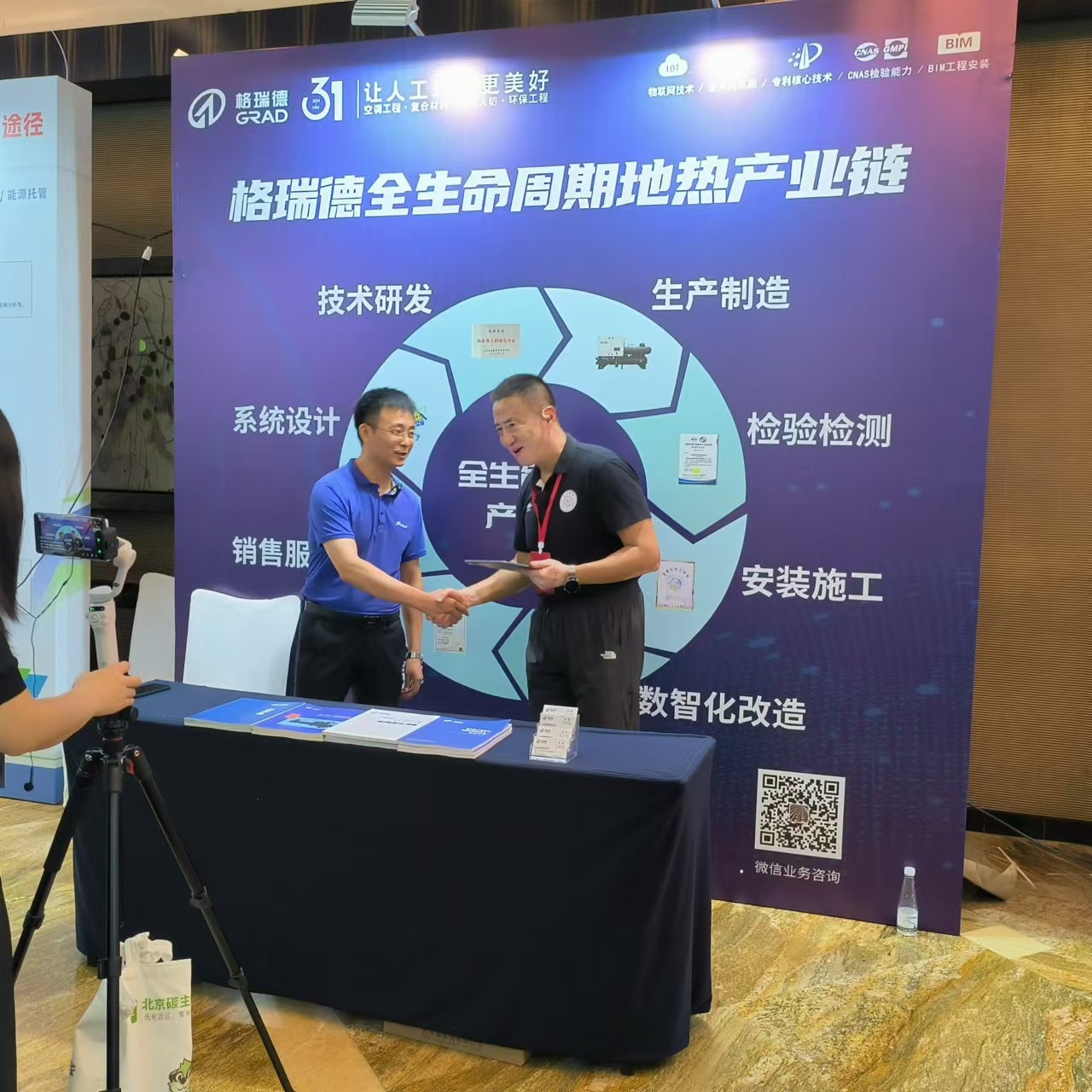 展会期间,由清华大学教授魏庆芃主持的直播节目“魏在现场”对副主任王涛进行了采访。王总向线上观众介绍了“格瑞德全生命周期地热产业链”模式,从热泵产品研发到定制化生产,再到产品的BIM安装、维修保养等全链条服务模式。并向大家介绍了集团在地源热泵领域的技术突破,以及整体提升地热高效利用效率的可持续发展理念。此次直播采访活动使更多地热同仁了解格瑞德,对格瑞德品牌影响力进一步提升有重要作用。