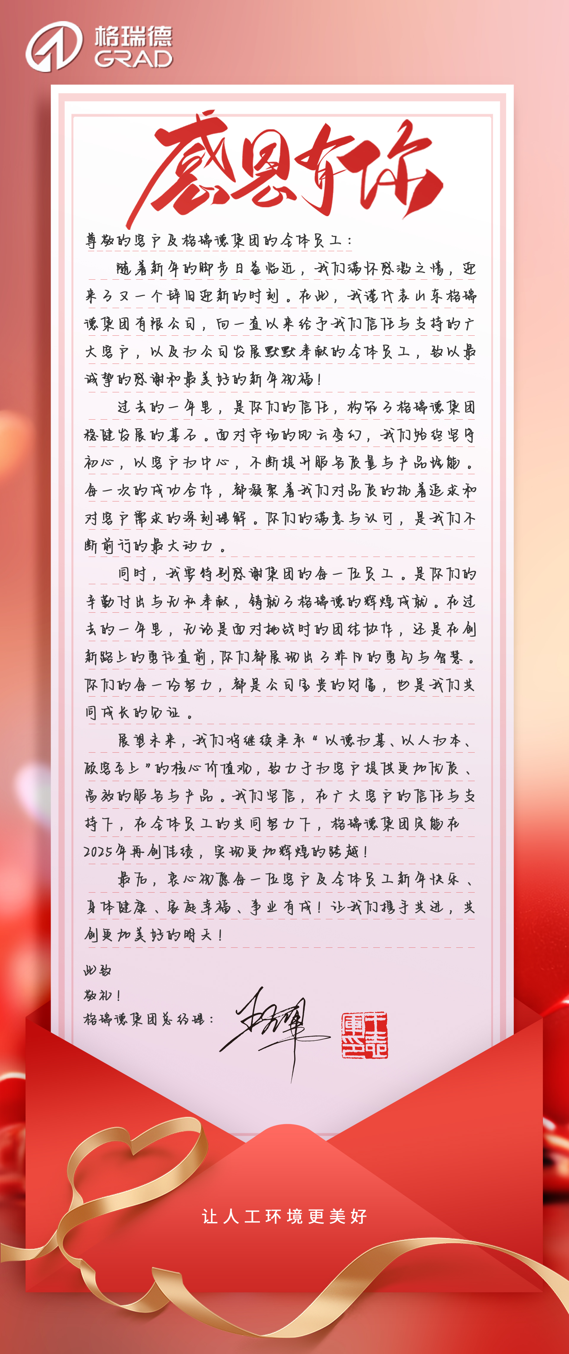 展望未来,我们将继续秉承“以德为基、以人为本、顾客至上”的核心价值观,致力于为客户提供更加优质、高效的服务与产品。我们坚信,在广大客户的信任与支持下,在全体员工的共同努力下,格瑞德集团定能在2025年再创佳绩,实现更加辉煌的跨越!