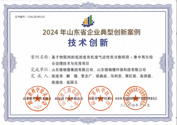 11月,山东省科学技术协会公示2024年山东省企业典型创新案例入选名单,格瑞德集团与环保科技公司共同研发的“基于物联网的低浓度有机废气活性炭分散吸附+集中再生综合治理技术与应用项目” 凭借在有机废气治理方面的先进性和创新性成功入选。