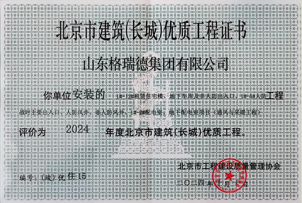 近日,由北京市工程建设资料管理协会下发《关于公示 2024 年度北京市建筑(长城)优质工程名单的通知》。其中山东格瑞德集团有限公司承揽的“ 1#-12#租赁住宅楼、地下车库及非人防出入口、1#-6#人防战时主要出入口、人防风井、非人防风井、1#-2#配电室、地下配电室项目(通风与采暖工程)工程 ”评为2024年度北京市建筑(长城)优质工程。