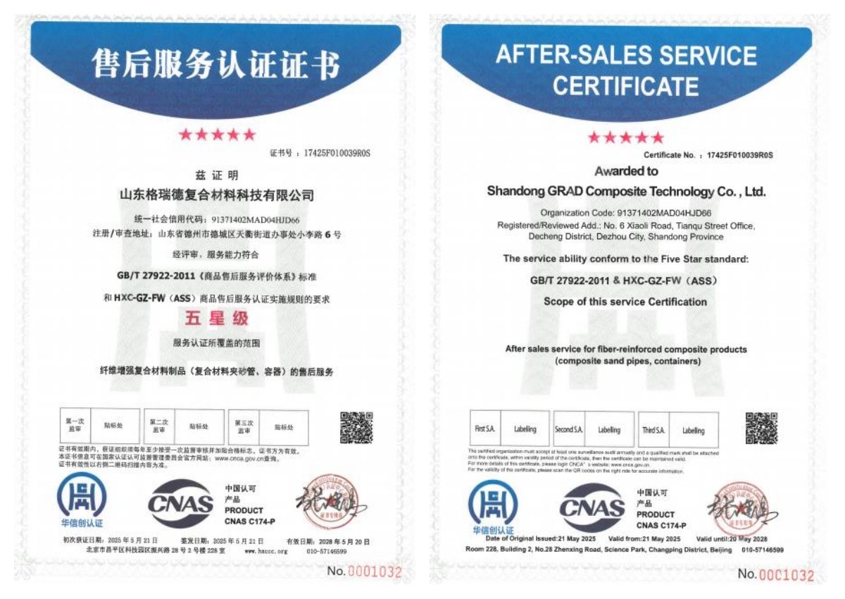 近日,山东格瑞德复合材料科技有限公司开展了为期两天的“售后服务评价体系”认证审核工作,在管业工程公司团队的全力配合下,售后服务体系审核顺利通过,并获得五星级售后服务认证证书。
