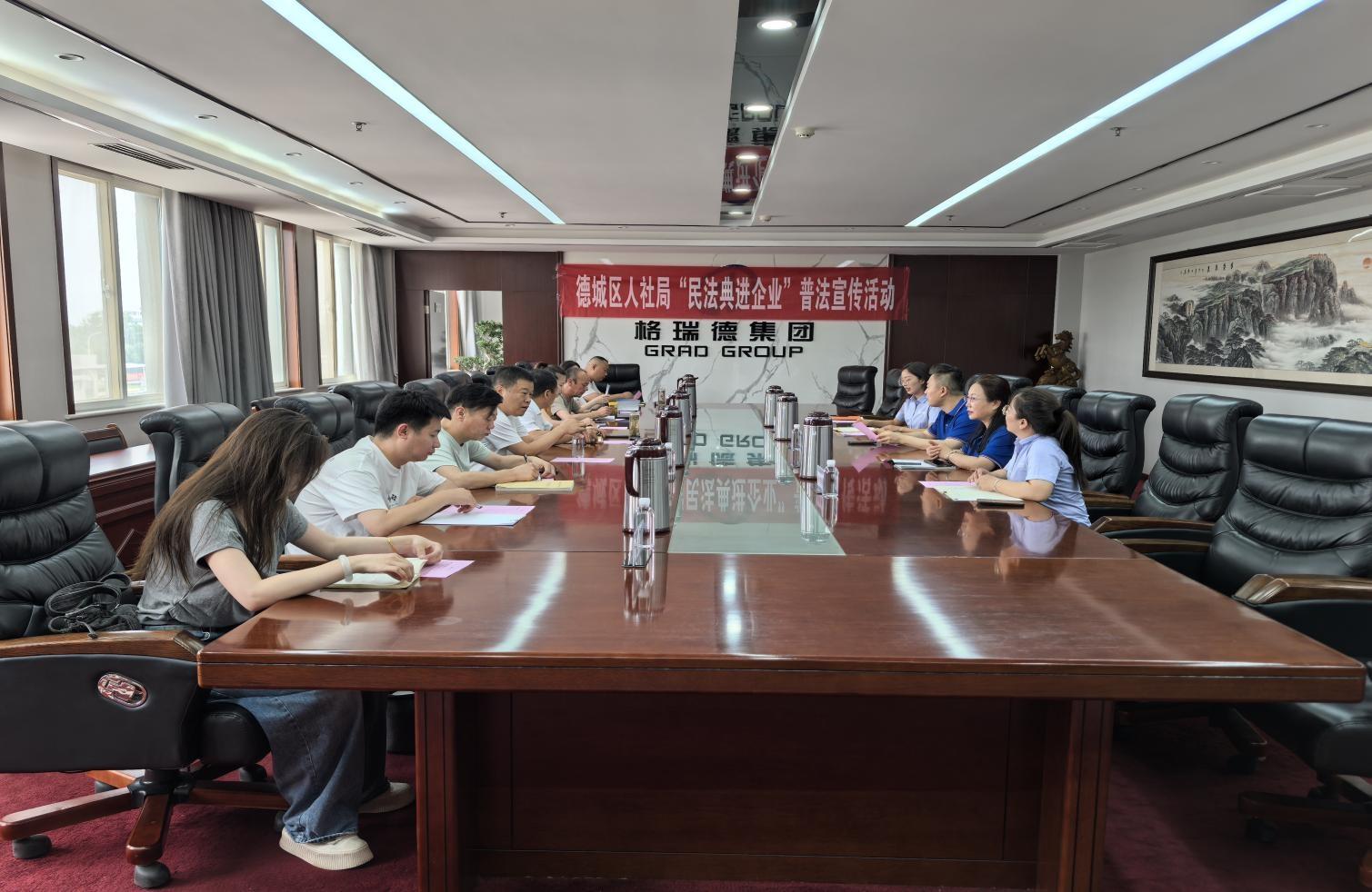 近日,德城区人力资源和社会保障局副局长许万家一行莅临格瑞德集团进行普法宣传活动。格瑞德集团总经理王志军及相关负责人陪同接待并参与普法宣传活动。
