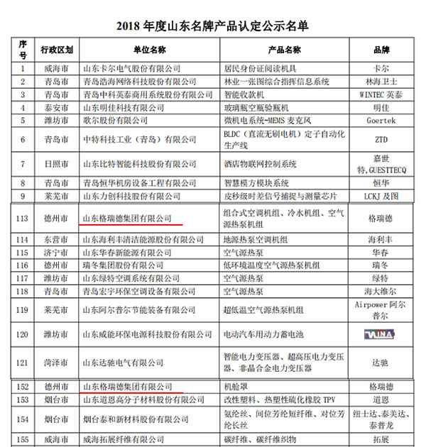 近日,从山东省质量评价协会官网发布的《关于公示2018年度山东名牌产品和山东省服务名牌拟认定名单的公告》中获悉,集团生产的组合式空调机组、冷水机组、空气源热泵机组、机舱罩被认定为2018年度“山东名牌”产品。