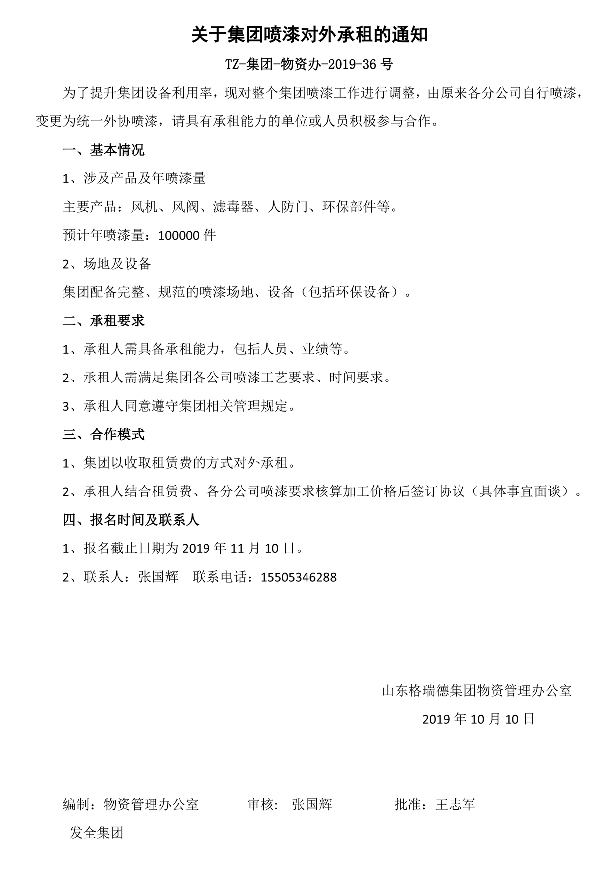 关于集团喷漆对外承租的通知