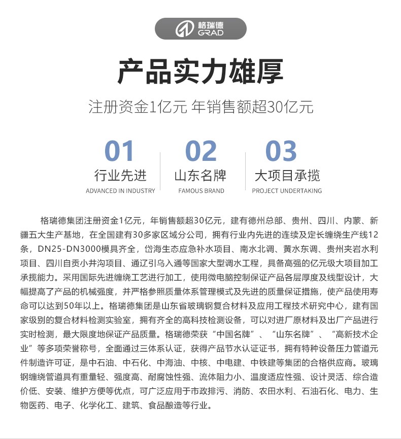 格瑞德进行全球化业务运作,产品和服务遍布全国的每一个省市和全球五大洲的100多个国家和地区,广泛应用于基建工程、商业地产、工业制造、农业开发、电子信息、车辆工程、环保处理、医药净化、海洋工程、轨道交通等领域。格瑞德从业人员过万人,在山东、贵州、四川、新疆、内蒙等地建有生产基地,在上海、北京、济南、兰州以及美国洛杉矶建有研发中心。